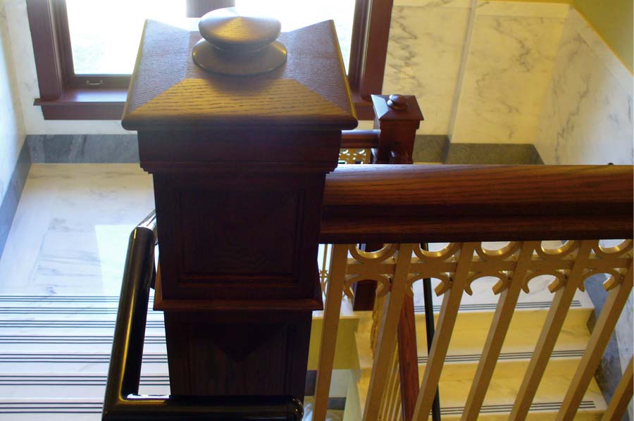 Highlights: Exterior Ornamental Railings - Bronze handrail and posts with patina and lacquer finish Interior Ornamental Railings - Stained Wood posts, painted steel pickets, laser cut decorative motif, powder coated paint finish. (1) Exterior Canopy - Fiberglass and steel construction, with a suspended metallized painted finish (SMF), then orbitally finished and patinaed. (3) Exterior Entrance Doors - Custom aluminum doors, with a suspended metallized painted finish (SMF), then orbitally finished and patinaed. (2) Exterior Aluminum Gates with a painted powder coated finish.