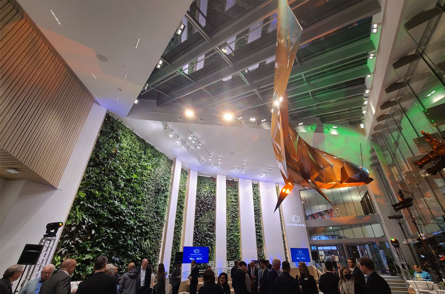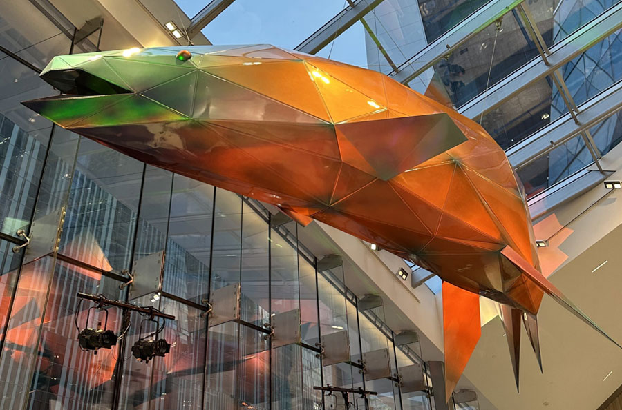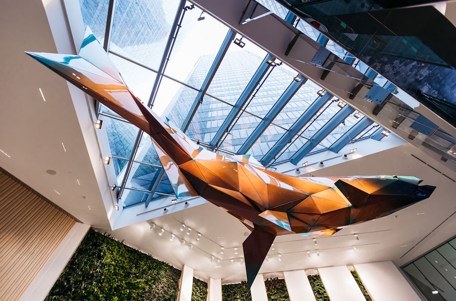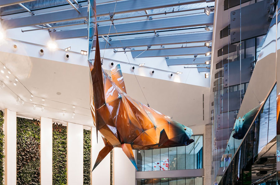 Scope: Soheil Mosun Limited collaborated closely with world renown Canadian artist, Douglas Coupland, in the manufacturing design, supply & installation of this multi-faceted salmon sculpture titled “Spawn”, a public art commission for Vancouver Centre II Office tower, in Vancouver, British Columbia