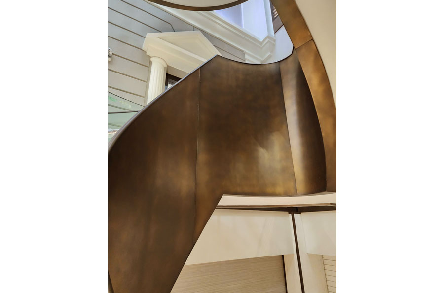 Highlights: Structural steel staircase clad with SML-C3 patinaed muntz bronze inside and outside of stringers. 168’ of railings are patinaed bronze and secured with custom built fasteners secured to posts and glazing. Structural steel components were 3D modeled and templated in shop and shipped to Bermuda for installation. Cladding is .050” Muntz Bronze cut and formed to the staircase. Stone treads and risers are comprised of white marble.