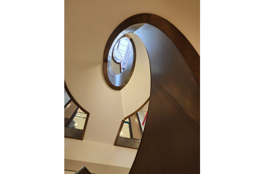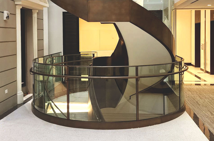 Scope: Soheil Mosun Limited was commissioned to design-build, supply and install this three (3) story custom eliptical staircase with patinaed bronze cladding, custom patinaed railings and glazing, for the main atrium of the Butterfield Bank, headquartered in Hamilton, Bermuda.