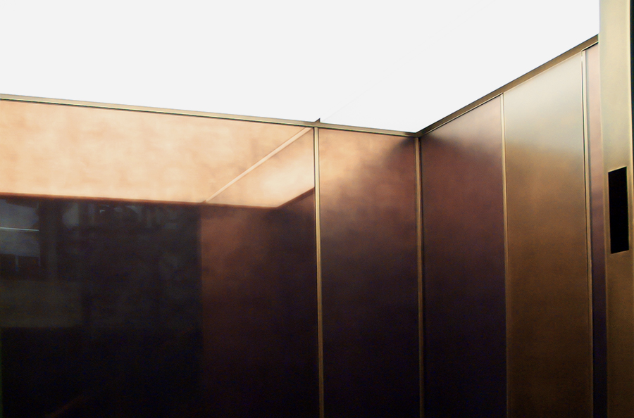 Highlights: The elevator interiors feature acid etched laminated glass wall panels with antique bronze reverse painted finish, laminated to honeycomb aluminum. The glass emulates the bronze cladded door, COP and front return panels, which are all patinated to an architecturally approved finish, then coated with a matte lacquer. The ceiling panels are fabricated 1/4” acrylic removable pans. Hand rails are orbitally finished, then patinated and lacquered.