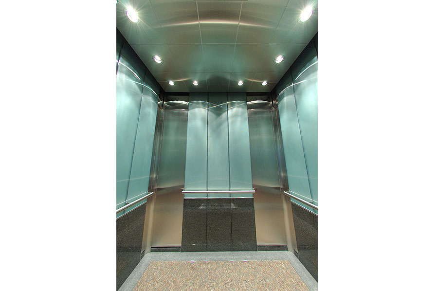 Highlights: Elevator interior walls feature back-painted reeded tempered glass, and rigidized st. stl. COP panels complimented with etched specification plates and illuminated call buttons. Ceilings feature exquisite brushed st. stl. and recessed pot lights. Transom panels are integrated with 'Captivate Network' ready monitors and hidden security cameras. The cab also boasts st. stl. handrails with no visible fasteners, granite wall and floor panels with inlay carpeting.